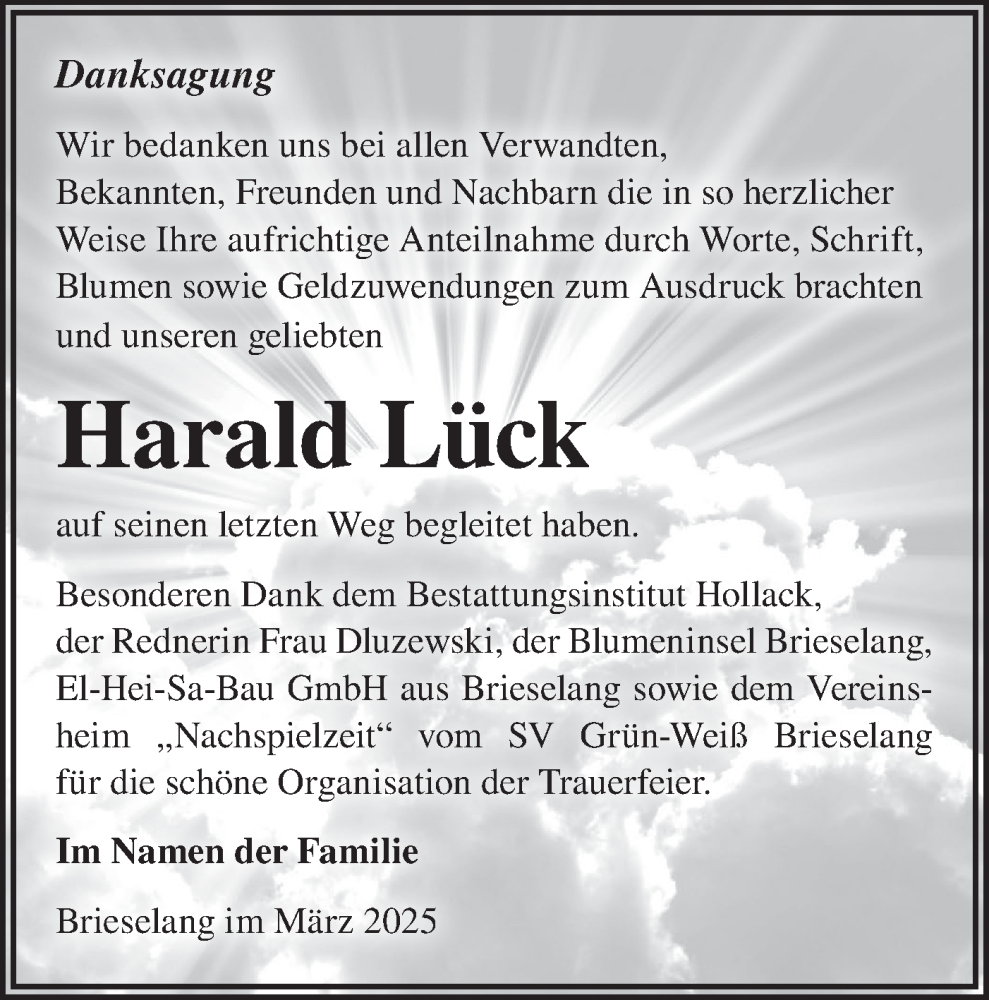Hier finden Sie alle Traueranzeigen aus der Zeitung, die bisher für Harald Lück erschienen sind. Weitere Traueranzeigen, die in der Zeitung erscheinen, werden hier ebenfalls aufgelistet