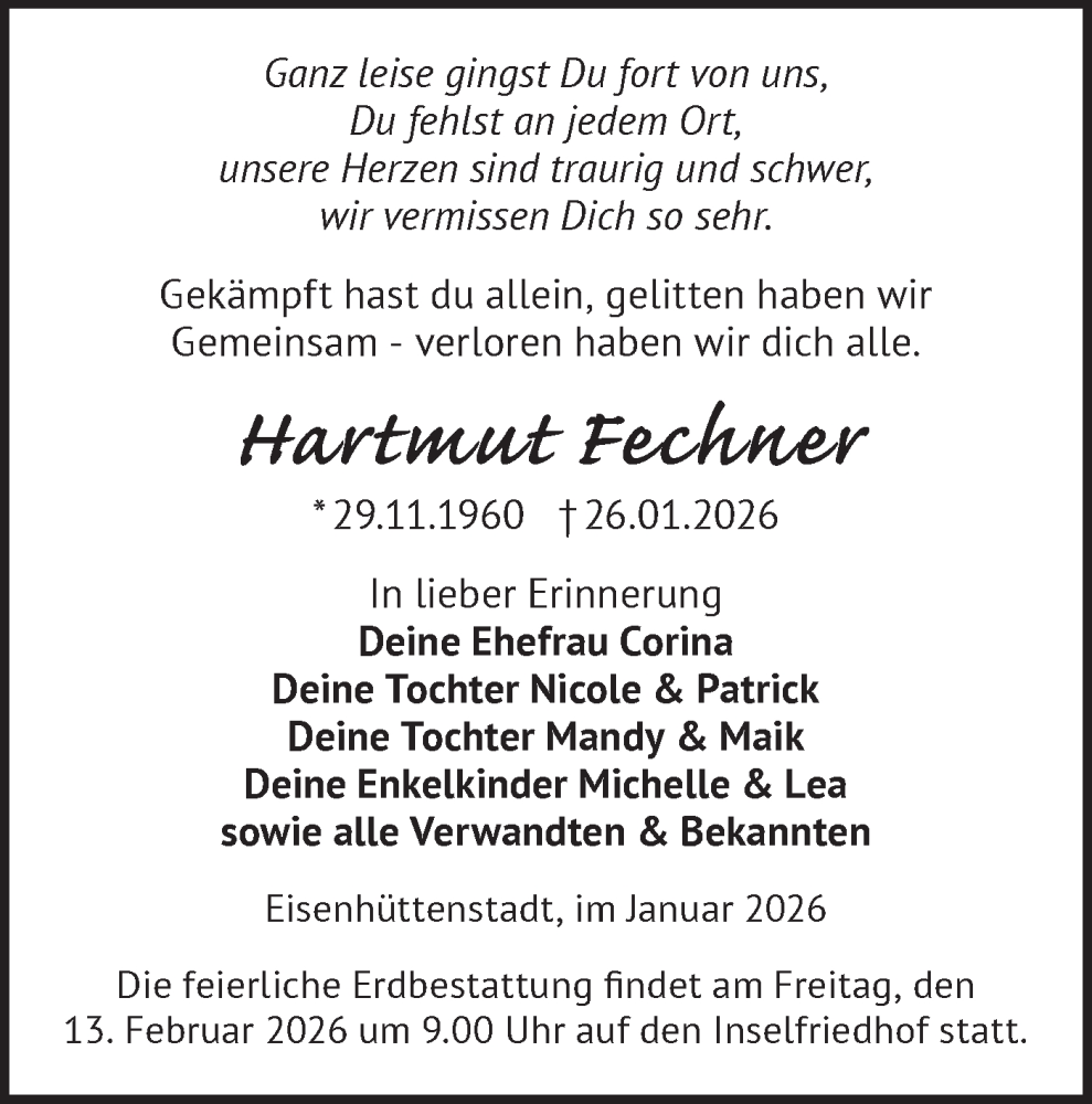 Hier finden Sie alle Traueranzeigen aus der Zeitung, die bisher für Hartmut Fechner erschienen sind. Weitere Traueranzeigen, die in der Zeitung erscheinen, werden hier ebenfalls aufgelistet