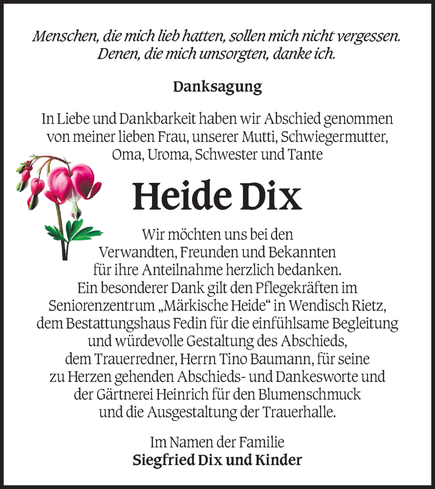 Hier finden Sie alle Traueranzeigen aus der Zeitung, die bisher für Heide Dix erschienen sind. Weitere Traueranzeigen, die in der Zeitung erscheinen, werden hier ebenfalls aufgelistet