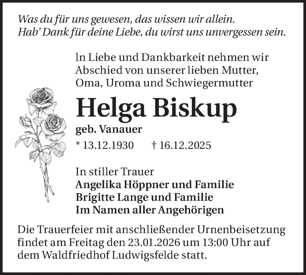 Hier finden Sie alle Traueranzeigen aus der Zeitung, die bisher für Helga Biskup erschienen sind. Weitere Traueranzeigen, die in der Zeitung erscheinen, werden hier ebenfalls aufgelistet