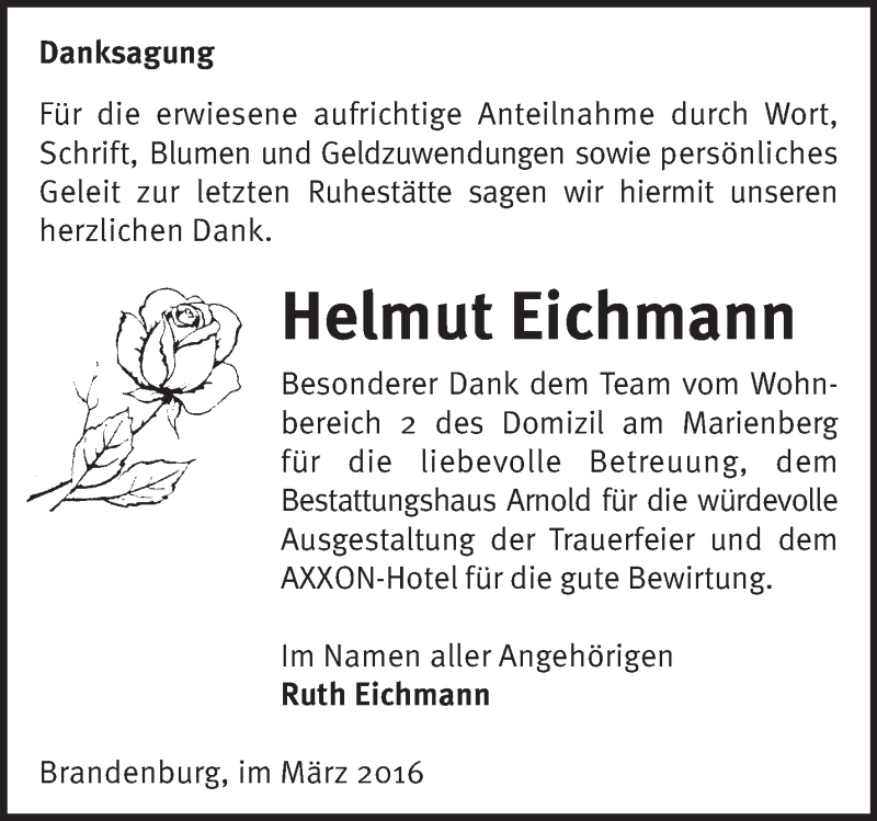 Hier finden Sie alle Traueranzeigen aus der Zeitung, die bisher für Helmut Eichmann erschienen sind. Weitere Traueranzeigen, die in der Zeitung erscheinen, werden hier ebenfalls aufgelistet