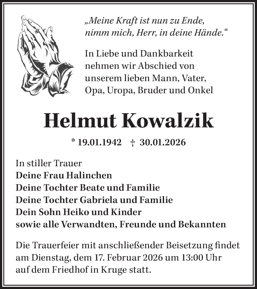 Hier finden Sie alle Traueranzeigen aus der Zeitung, die bisher für Helmut Kowalzik erschienen sind. Weitere Traueranzeigen, die in der Zeitung erscheinen, werden hier ebenfalls aufgelistet
