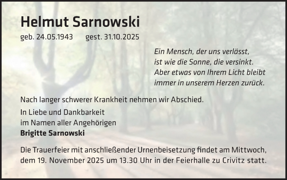 Hier finden Sie alle Traueranzeigen aus der Zeitung, die bisher für Helmut Sarnowski erschienen sind. Weitere Traueranzeigen, die in der Zeitung erscheinen, werden hier ebenfalls aufgelistet