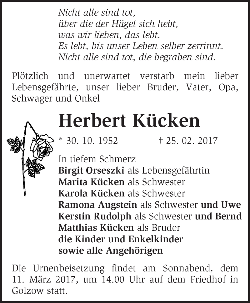 Hier finden Sie alle Traueranzeigen aus der Zeitung, die bisher für Herbert Kücken erschienen sind. Weitere Traueranzeigen, die in der Zeitung erscheinen, werden hier ebenfalls aufgelistet
