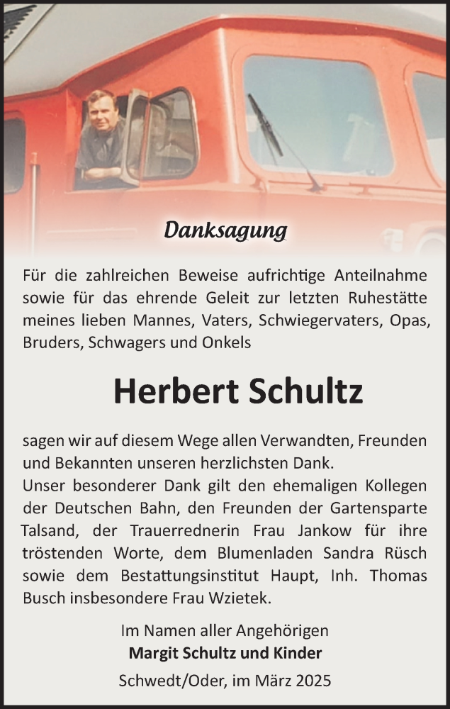 Hier finden Sie alle Traueranzeigen aus der Zeitung, die bisher für Herbert Schultz erschienen sind. Weitere Traueranzeigen, die in der Zeitung erscheinen, werden hier ebenfalls aufgelistet