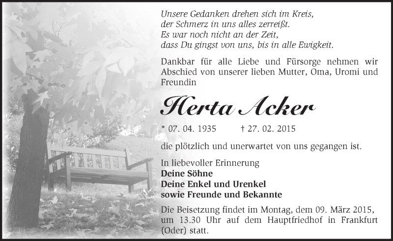 Hier finden Sie alle Traueranzeigen aus der Zeitung, die bisher für Herta Acker erschienen sind. Weitere Traueranzeigen, die in der Zeitung erscheinen, werden hier ebenfalls aufgelistet