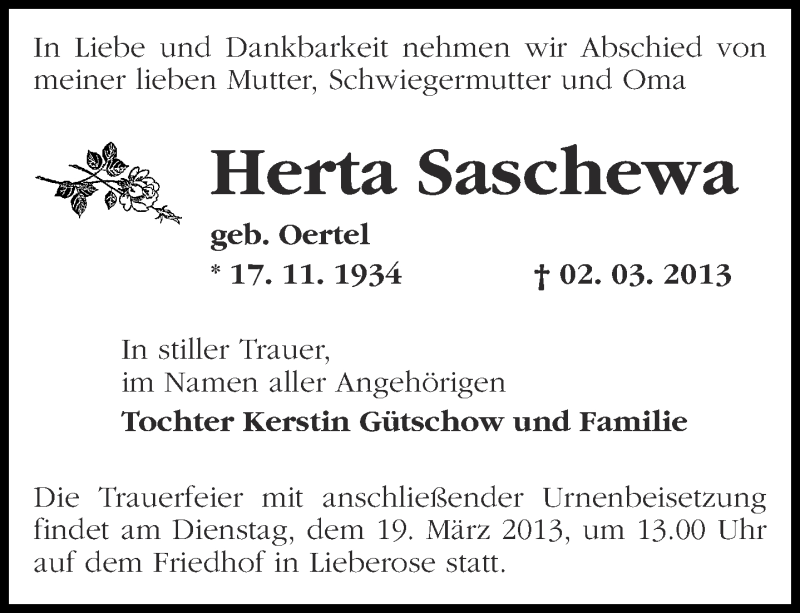 Hier finden Sie alle Traueranzeigen aus der Zeitung, die bisher für Herta Saschewa erschienen sind. Weitere Traueranzeigen, die in der Zeitung erscheinen, werden hier ebenfalls aufgelistet