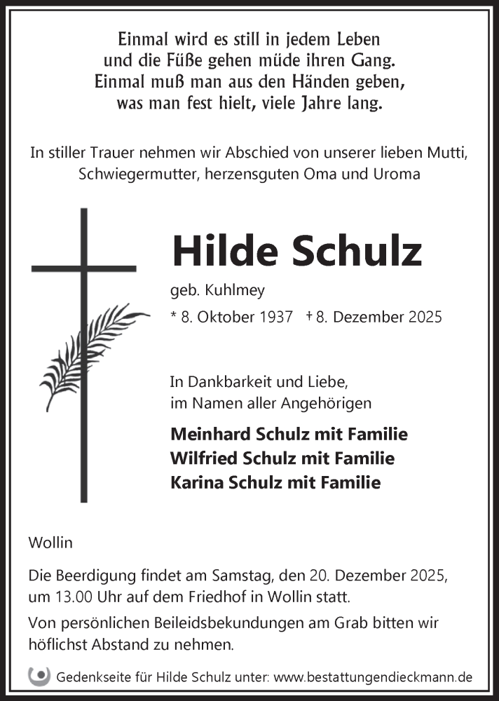 Hier finden Sie alle Traueranzeigen aus der Zeitung, die bisher für Hilde Schulz erschienen sind. Weitere Traueranzeigen, die in der Zeitung erscheinen, werden hier ebenfalls aufgelistet