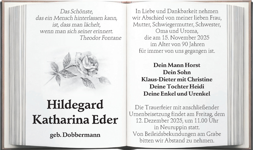 Hier finden Sie alle Traueranzeigen aus der Zeitung, die bisher für Hildegard Katharina Eder erschienen sind. Weitere Traueranzeigen, die in der Zeitung erscheinen, werden hier ebenfalls aufgelistet