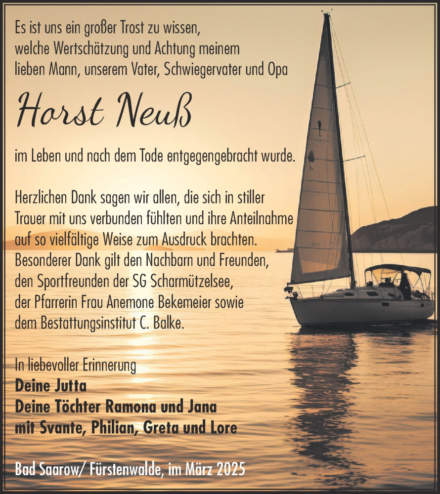 Hier finden Sie alle Traueranzeigen aus der Zeitung, die bisher für Horst Neuß erschienen sind. Weitere Traueranzeigen, die in der Zeitung erscheinen, werden hier ebenfalls aufgelistet
