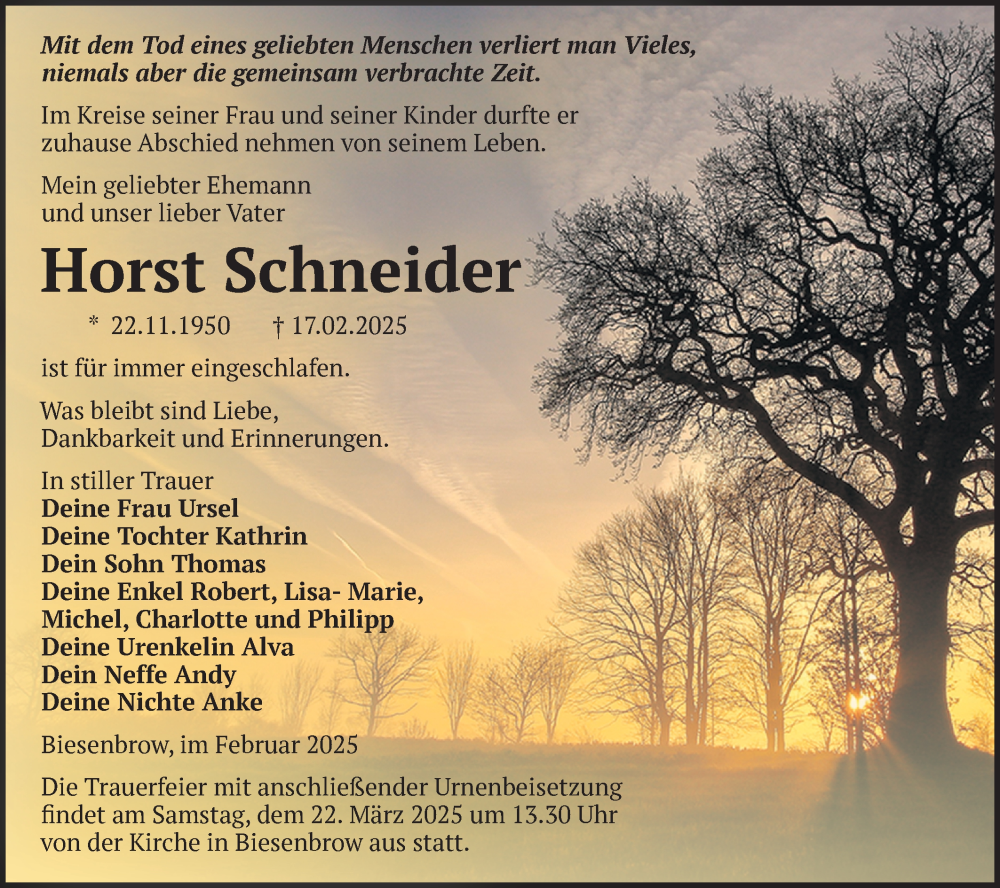 Hier finden Sie alle Traueranzeigen aus der Zeitung, die bisher für Horst Schneider erschienen sind. Weitere Traueranzeigen, die in der Zeitung erscheinen, werden hier ebenfalls aufgelistet
