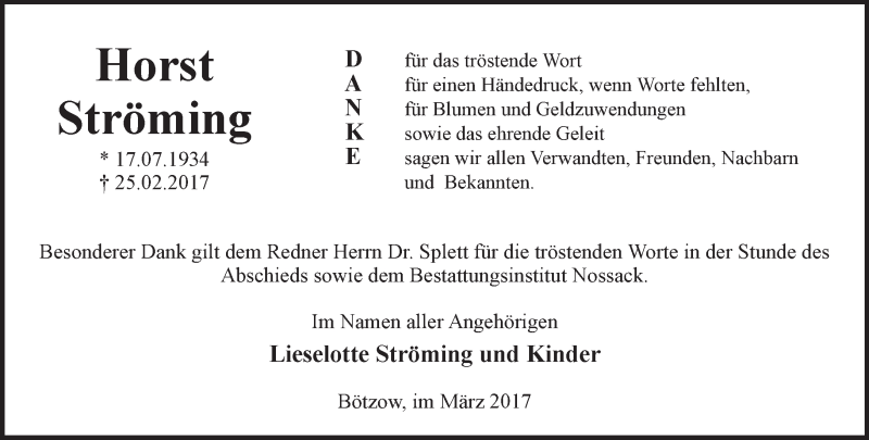 Hier finden Sie alle Traueranzeigen aus der Zeitung, die bisher für Horst Ströming erschienen sind. Weitere Traueranzeigen, die in der Zeitung erscheinen, werden hier ebenfalls aufgelistet