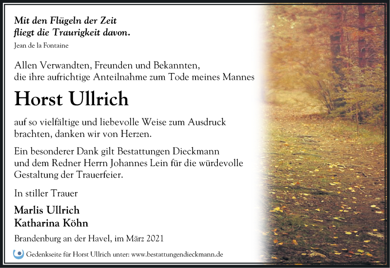 Hier finden Sie alle Traueranzeigen aus der Zeitung, die bisher für Horst Ullrich erschienen sind. Weitere Traueranzeigen, die in der Zeitung erscheinen, werden hier ebenfalls aufgelistet