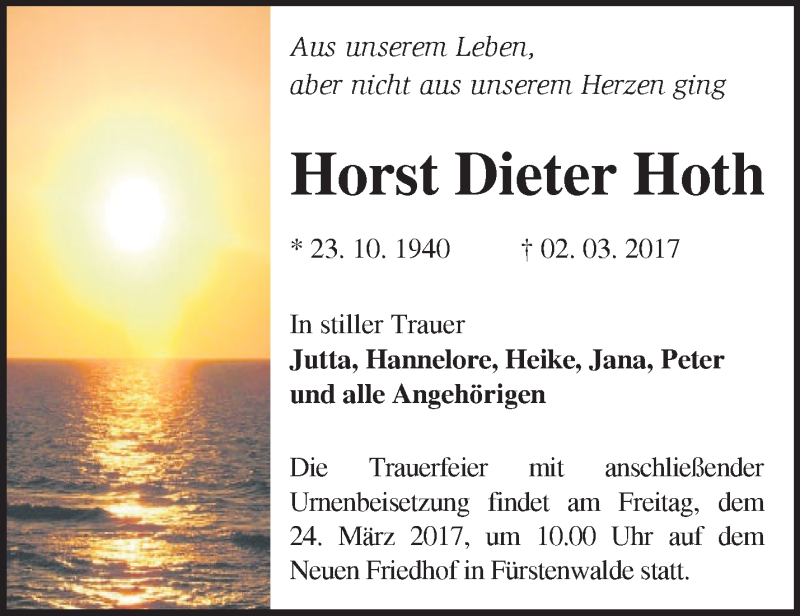 Hier finden Sie alle Traueranzeigen aus der Zeitung, die bisher für Horst Dieter Hoth erschienen sind. Weitere Traueranzeigen, die in der Zeitung erscheinen, werden hier ebenfalls aufgelistet