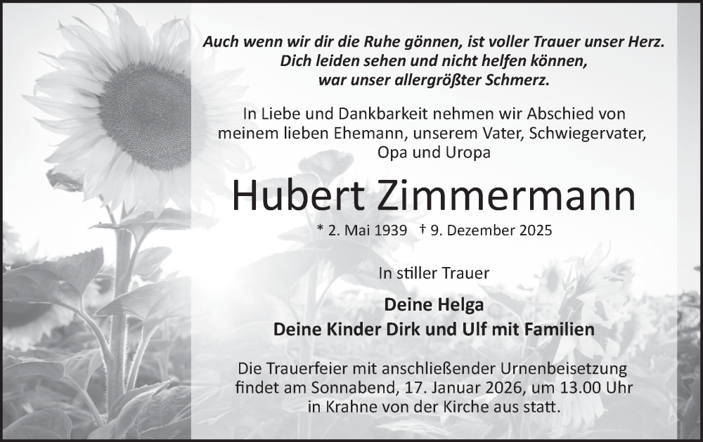 Hier finden Sie alle Traueranzeigen aus der Zeitung, die bisher für Hubert Zimmermann erschienen sind. Weitere Traueranzeigen, die in der Zeitung erscheinen, werden hier ebenfalls aufgelistet