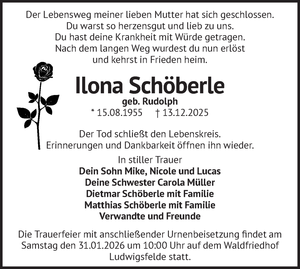 Hier finden Sie alle Traueranzeigen aus der Zeitung, die bisher für Ilona Schöberle erschienen sind. Weitere Traueranzeigen, die in der Zeitung erscheinen, werden hier ebenfalls aufgelistet