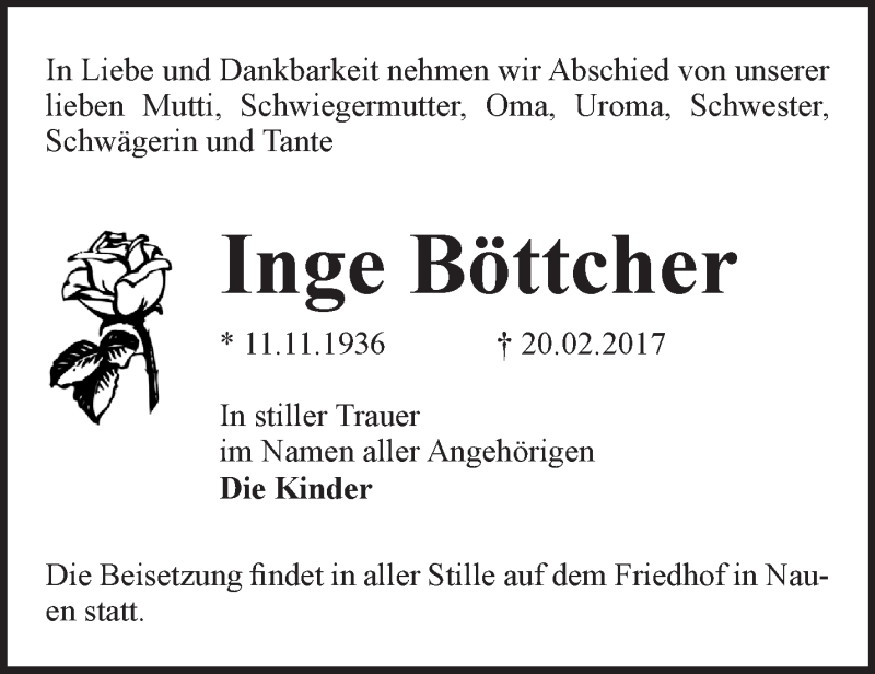 Hier finden Sie alle Traueranzeigen aus der Zeitung, die bisher für Inge Böttcher erschienen sind. Weitere Traueranzeigen, die in der Zeitung erscheinen, werden hier ebenfalls aufgelistet