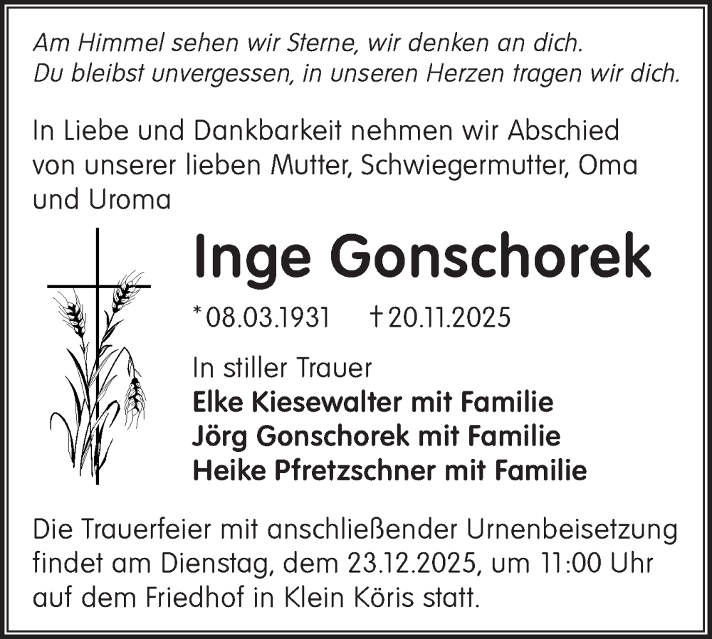 Hier finden Sie alle Traueranzeigen aus der Zeitung, die bisher für Inge Gonschorek erschienen sind. Weitere Traueranzeigen, die in der Zeitung erscheinen, werden hier ebenfalls aufgelistet