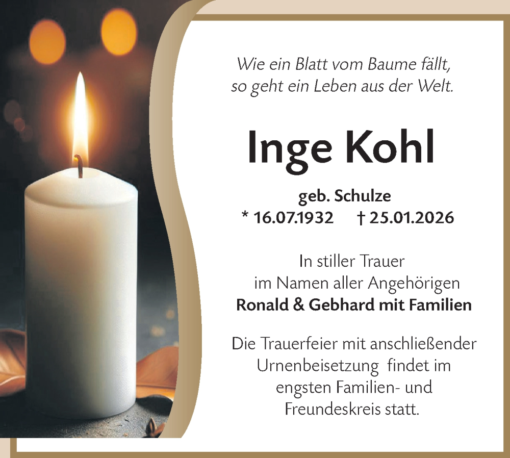 Hier finden Sie alle Traueranzeigen aus der Zeitung, die bisher für Inge Kohl erschienen sind. Weitere Traueranzeigen, die in der Zeitung erscheinen, werden hier ebenfalls aufgelistet