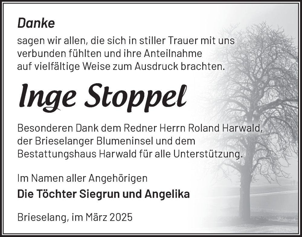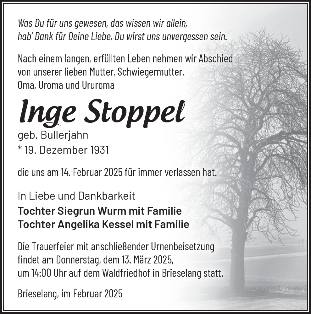 Hier finden Sie alle Traueranzeigen aus der Zeitung, die bisher für Inge Stoppel erschienen sind. Weitere Traueranzeigen, die in der Zeitung erscheinen, werden hier ebenfalls aufgelistet