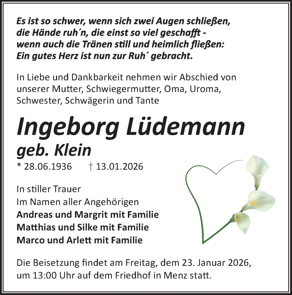 Hier finden Sie alle Traueranzeigen aus der Zeitung, die bisher für Ingeborg Lüdemann erschienen sind. Weitere Traueranzeigen, die in der Zeitung erscheinen, werden hier ebenfalls aufgelistet