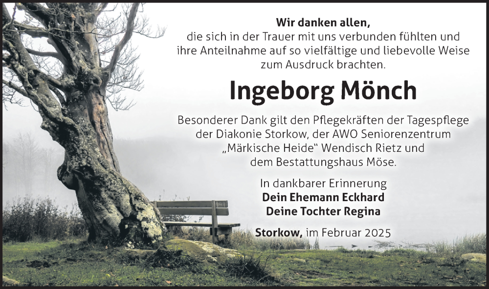 Hier finden Sie alle Traueranzeigen aus der Zeitung, die bisher für Ingeborg Mönch erschienen sind. Weitere Traueranzeigen, die in der Zeitung erscheinen, werden hier ebenfalls aufgelistet
