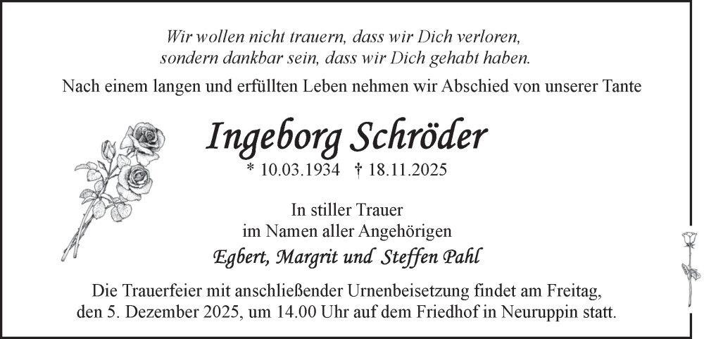 Hier finden Sie alle Traueranzeigen aus der Zeitung, die bisher für Ingeborg Schröder erschienen sind. Weitere Traueranzeigen, die in der Zeitung erscheinen, werden hier ebenfalls aufgelistet
