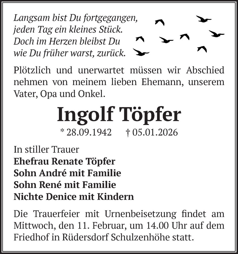 Hier finden Sie alle Traueranzeigen aus der Zeitung, die bisher für Ingolf Töpfer erschienen sind. Weitere Traueranzeigen, die in der Zeitung erscheinen, werden hier ebenfalls aufgelistet