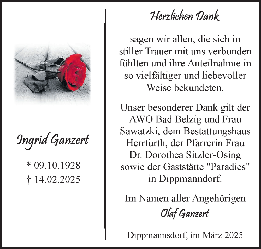 Hier finden Sie alle Traueranzeigen aus der Zeitung, die bisher für Ingrid Ganzert erschienen sind. Weitere Traueranzeigen, die in der Zeitung erscheinen, werden hier ebenfalls aufgelistet