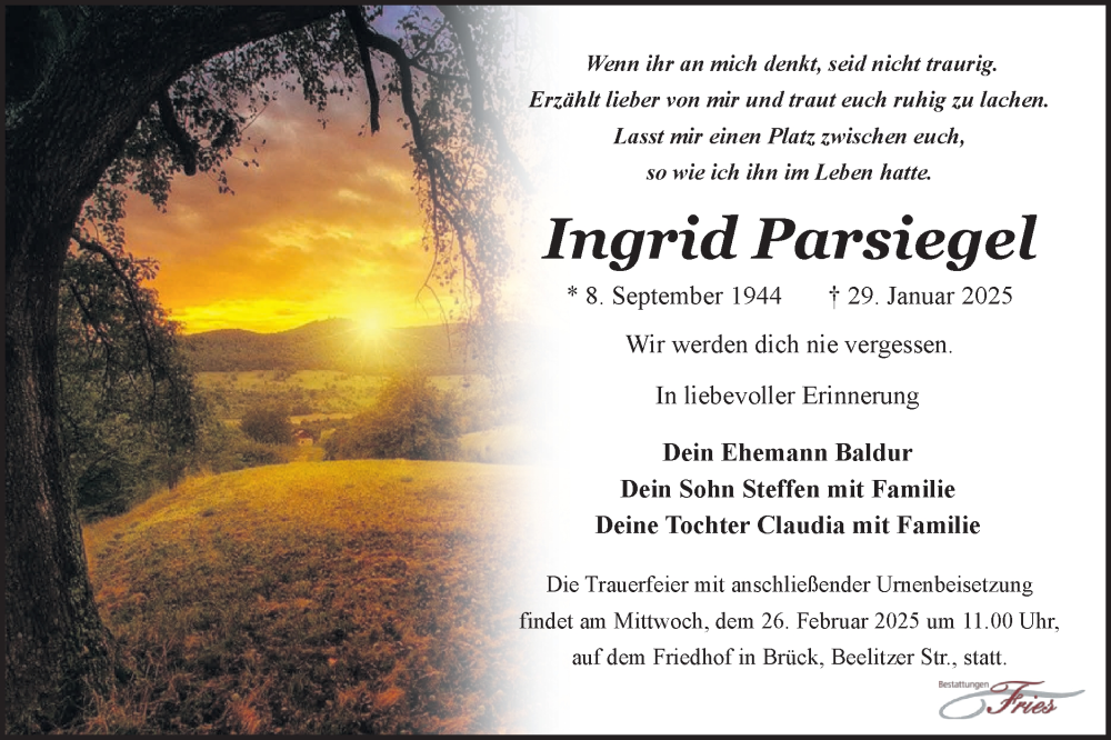 Hier finden Sie alle Traueranzeigen aus der Zeitung, die bisher für Ingrid Parsiegel erschienen sind. Weitere Traueranzeigen, die in der Zeitung erscheinen, werden hier ebenfalls aufgelistet