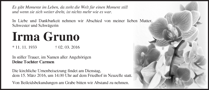 Hier finden Sie alle Traueranzeigen aus der Zeitung, die bisher für Irma Gruno erschienen sind. Weitere Traueranzeigen, die in der Zeitung erscheinen, werden hier ebenfalls aufgelistet