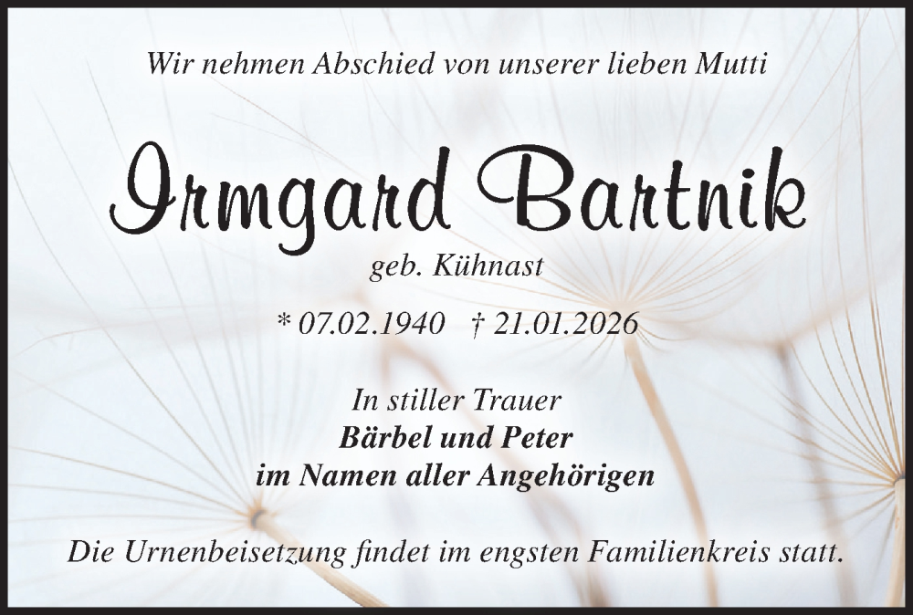 Hier finden Sie alle Traueranzeigen aus der Zeitung, die bisher für Irmgard Bartnik erschienen sind. Weitere Traueranzeigen, die in der Zeitung erscheinen, werden hier ebenfalls aufgelistet