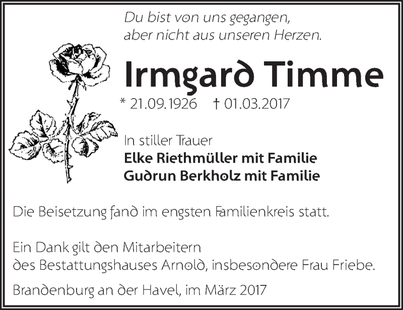 Hier finden Sie alle Traueranzeigen aus der Zeitung, die bisher für Irmgard Timme erschienen sind. Weitere Traueranzeigen, die in der Zeitung erscheinen, werden hier ebenfalls aufgelistet