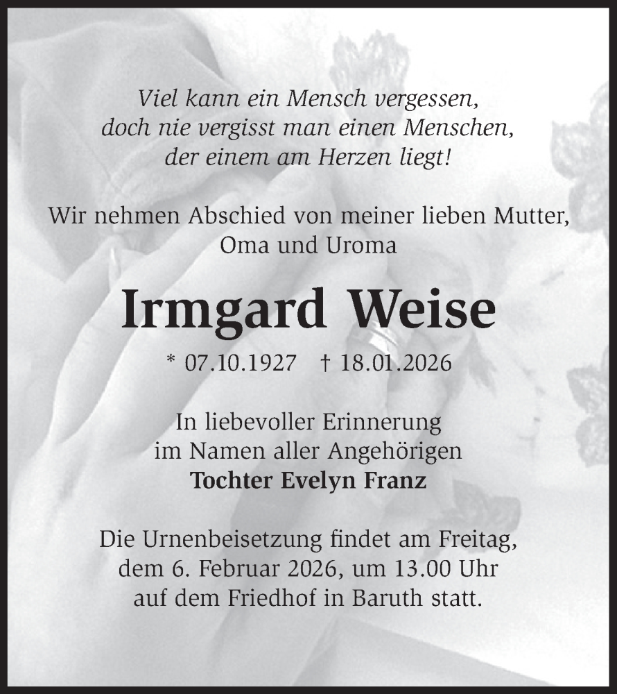 Hier finden Sie alle Traueranzeigen aus der Zeitung, die bisher für Irmgard Weise erschienen sind. Weitere Traueranzeigen, die in der Zeitung erscheinen, werden hier ebenfalls aufgelistet