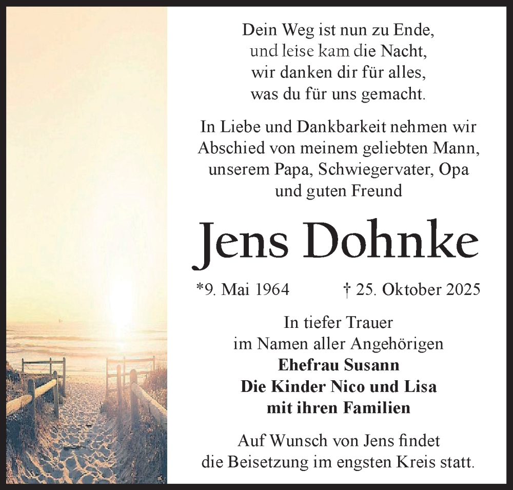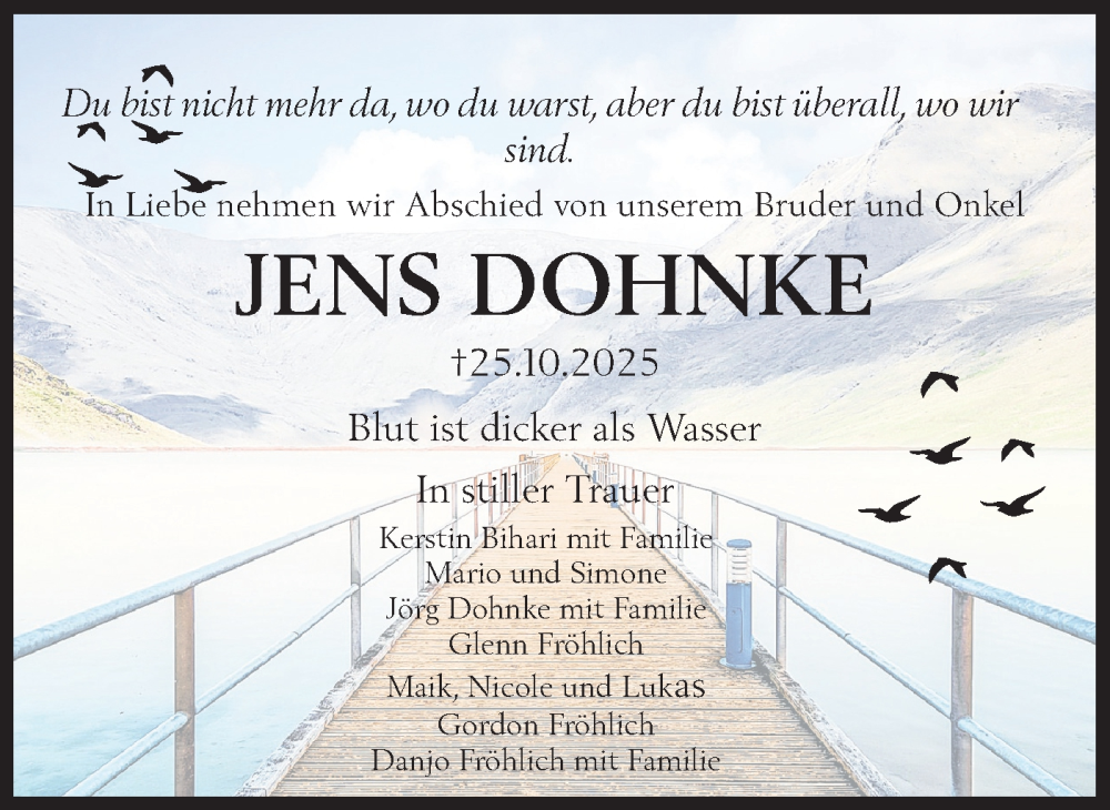 Hier finden Sie alle Traueranzeigen aus der Zeitung, die bisher für Jens Dohnke erschienen sind. Weitere Traueranzeigen, die in der Zeitung erscheinen, werden hier ebenfalls aufgelistet