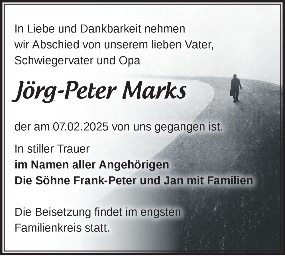 Hier finden Sie alle Traueranzeigen aus der Zeitung, die bisher für Jörg-Peter Marks erschienen sind. Weitere Traueranzeigen, die in der Zeitung erscheinen, werden hier ebenfalls aufgelistet