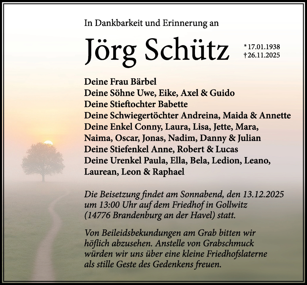 Hier finden Sie alle Traueranzeigen aus der Zeitung, die bisher für Jörg Schütz erschienen sind. Weitere Traueranzeigen, die in der Zeitung erscheinen, werden hier ebenfalls aufgelistet