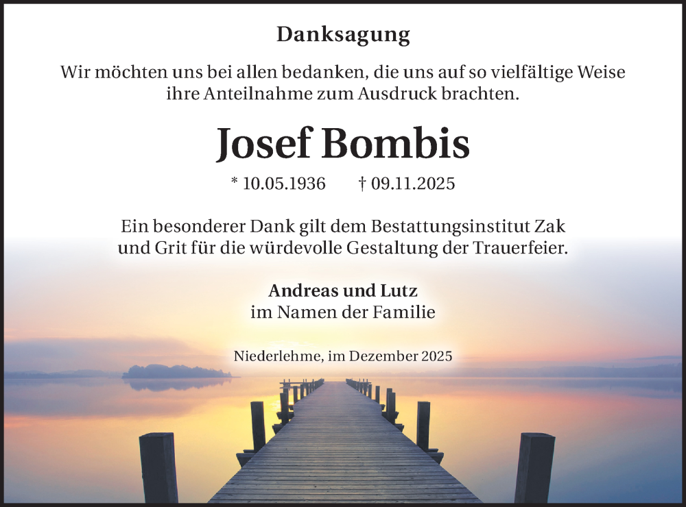 Hier finden Sie alle Traueranzeigen aus der Zeitung, die bisher für Josef Bombis erschienen sind. Weitere Traueranzeigen, die in der Zeitung erscheinen, werden hier ebenfalls aufgelistet