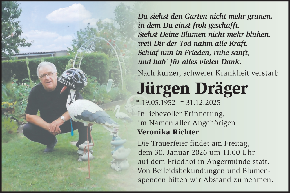 Hier finden Sie alle Traueranzeigen aus der Zeitung, die bisher für Jürgen Dräger erschienen sind. Weitere Traueranzeigen, die in der Zeitung erscheinen, werden hier ebenfalls aufgelistet