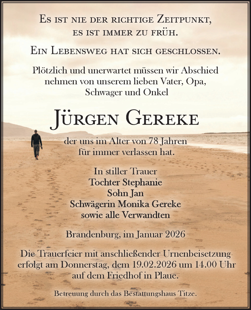 Hier finden Sie alle Traueranzeigen aus der Zeitung, die bisher für Jürgen Gereke erschienen sind. Weitere Traueranzeigen, die in der Zeitung erscheinen, werden hier ebenfalls aufgelistet