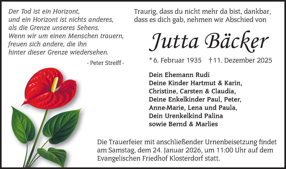 Hier finden Sie alle Traueranzeigen aus der Zeitung, die bisher für Jutta Bäcker erschienen sind. Weitere Traueranzeigen, die in der Zeitung erscheinen, werden hier ebenfalls aufgelistet