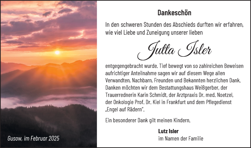 Hier finden Sie alle Traueranzeigen aus der Zeitung, die bisher für Jutta Isler erschienen sind. Weitere Traueranzeigen, die in der Zeitung erscheinen, werden hier ebenfalls aufgelistet