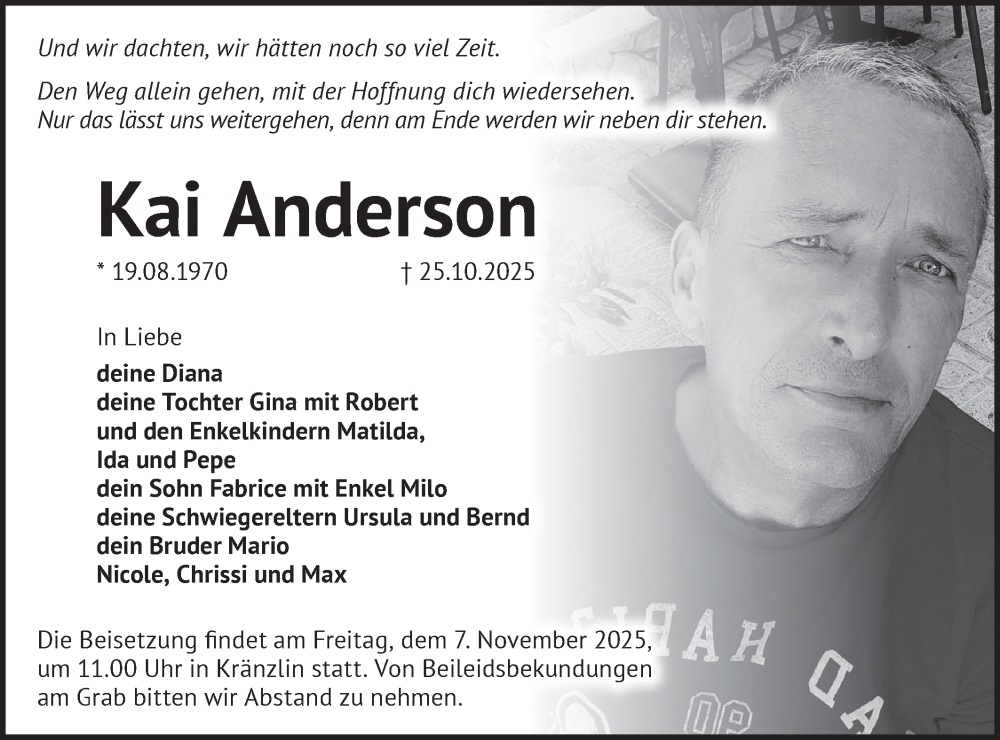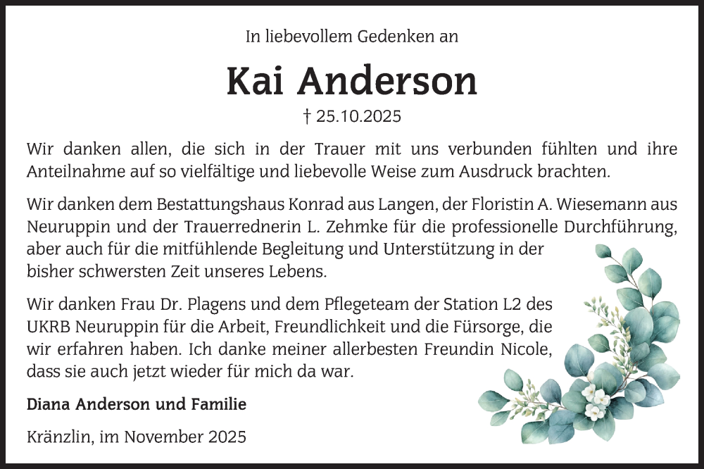 Hier finden Sie alle Traueranzeigen aus der Zeitung, die bisher für Kai Anderson erschienen sind. Weitere Traueranzeigen, die in der Zeitung erscheinen, werden hier ebenfalls aufgelistet