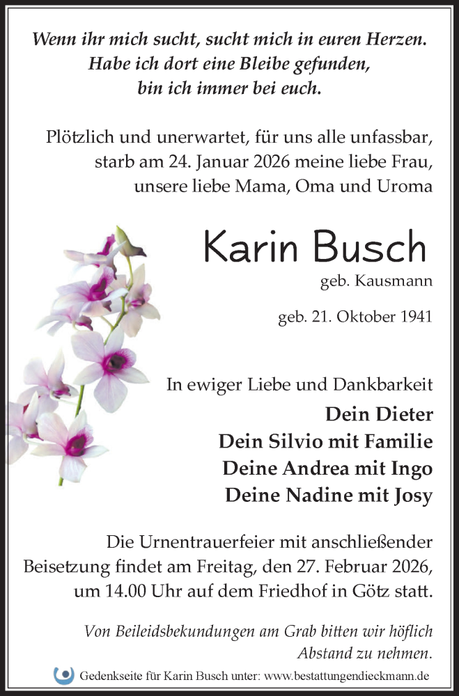 Hier finden Sie alle Traueranzeigen aus der Zeitung, die bisher für Karin Busch erschienen sind. Weitere Traueranzeigen, die in der Zeitung erscheinen, werden hier ebenfalls aufgelistet