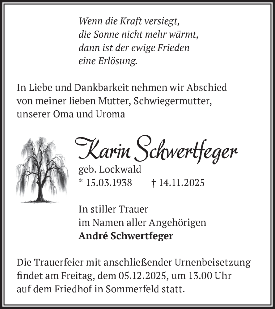 Hier finden Sie alle Traueranzeigen aus der Zeitung, die bisher für Karin Schwertfeger erschienen sind. Weitere Traueranzeigen, die in der Zeitung erscheinen, werden hier ebenfalls aufgelistet
