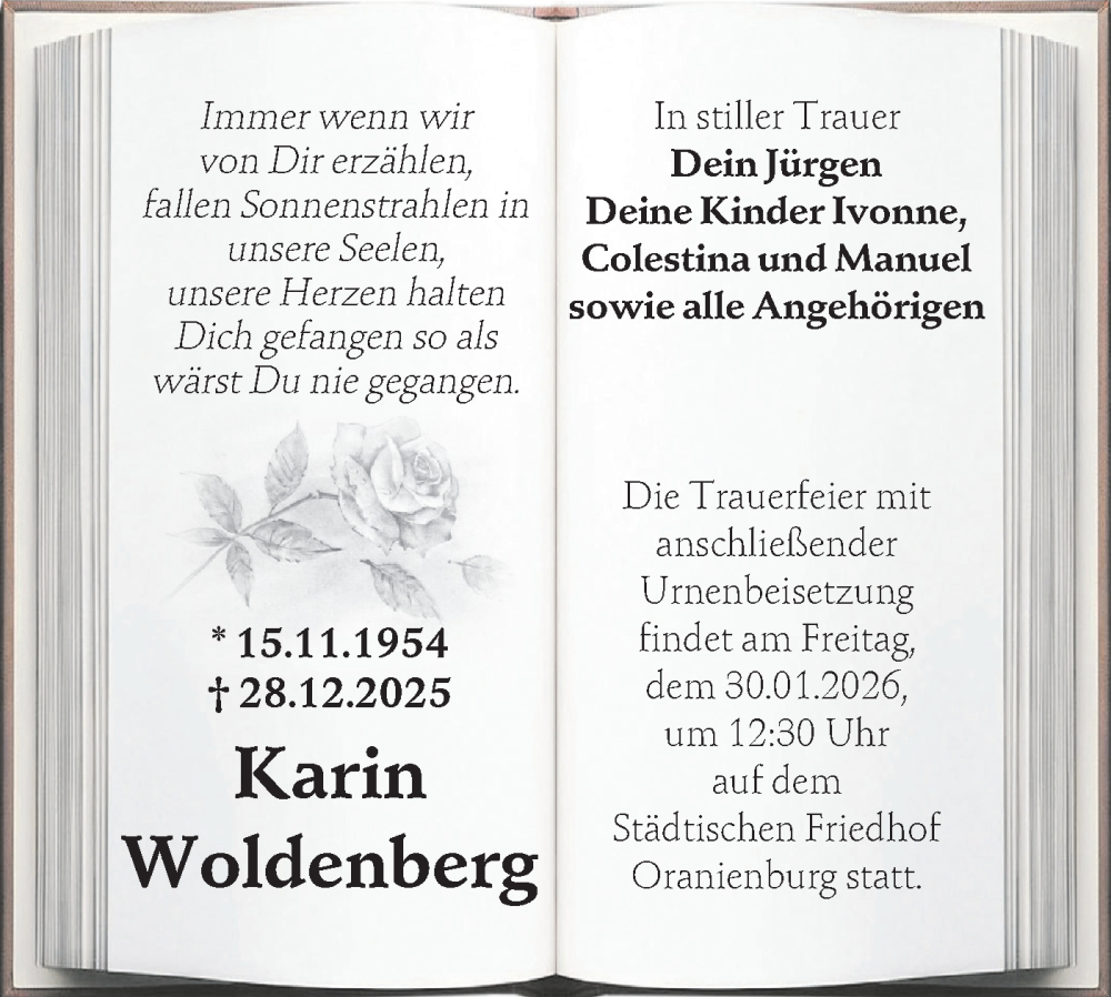 Hier finden Sie alle Traueranzeigen aus der Zeitung, die bisher für Karin Woldenberg erschienen sind. Weitere Traueranzeigen, die in der Zeitung erscheinen, werden hier ebenfalls aufgelistet