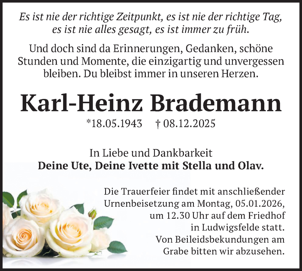 Hier finden Sie alle Traueranzeigen aus der Zeitung, die bisher für Karl-Heinz Brademann erschienen sind. Weitere Traueranzeigen, die in der Zeitung erscheinen, werden hier ebenfalls aufgelistet