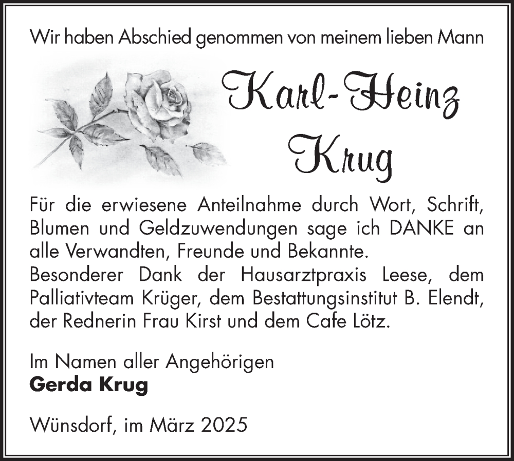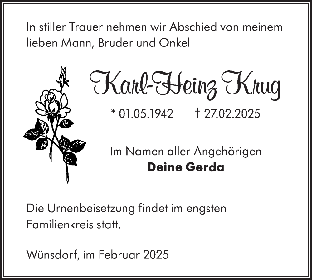 Hier finden Sie alle Traueranzeigen aus der Zeitung, die bisher für Karl-Heinz Krug erschienen sind. Weitere Traueranzeigen, die in der Zeitung erscheinen, werden hier ebenfalls aufgelistet