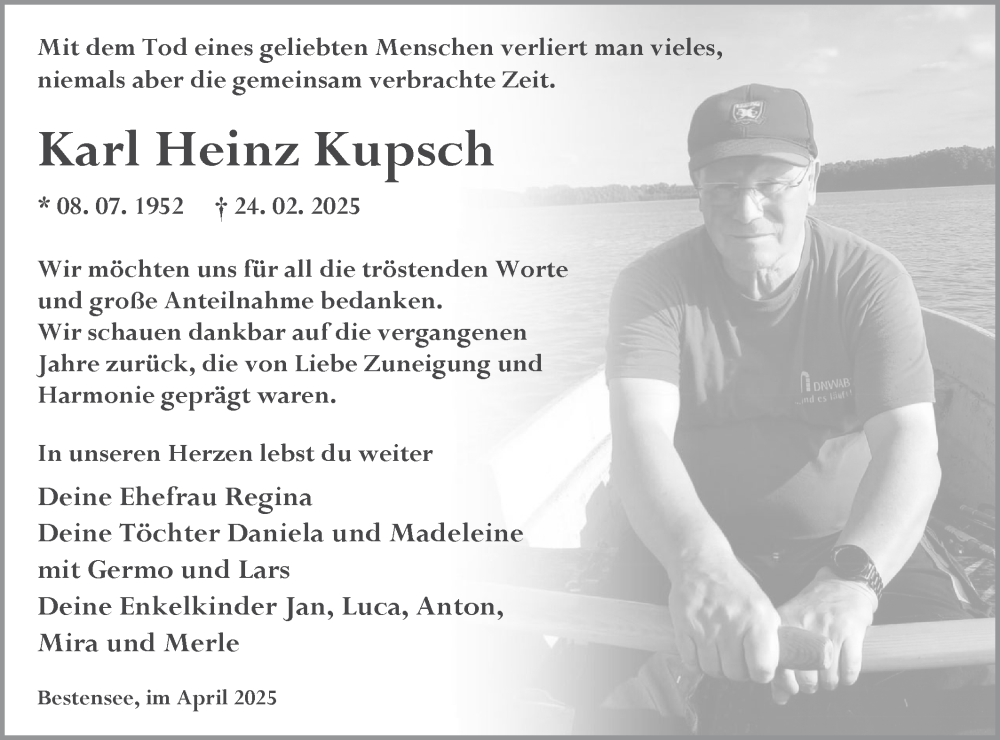 Hier finden Sie alle Traueranzeigen aus der Zeitung, die bisher für Karl Heinz Kupsch erschienen sind. Weitere Traueranzeigen, die in der Zeitung erscheinen, werden hier ebenfalls aufgelistet