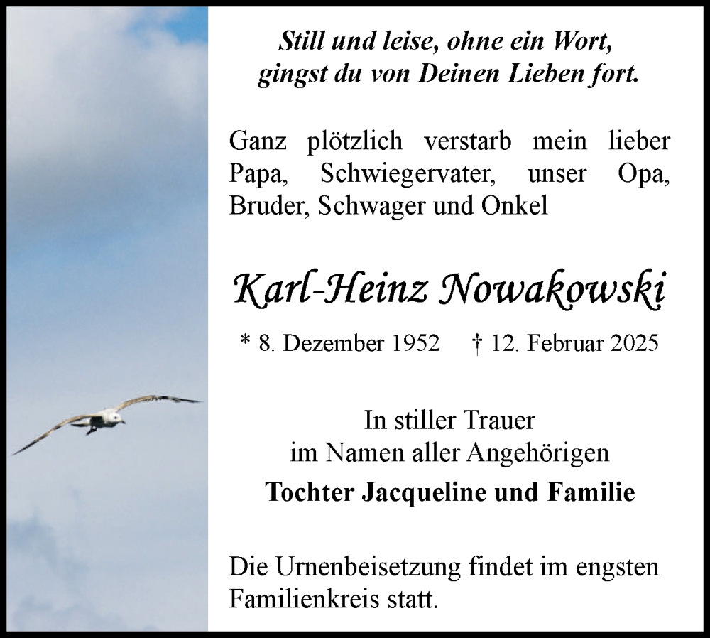 Hier finden Sie alle Traueranzeigen aus der Zeitung, die bisher für Karl-Heinz Nowakowski erschienen sind. Weitere Traueranzeigen, die in der Zeitung erscheinen, werden hier ebenfalls aufgelistet